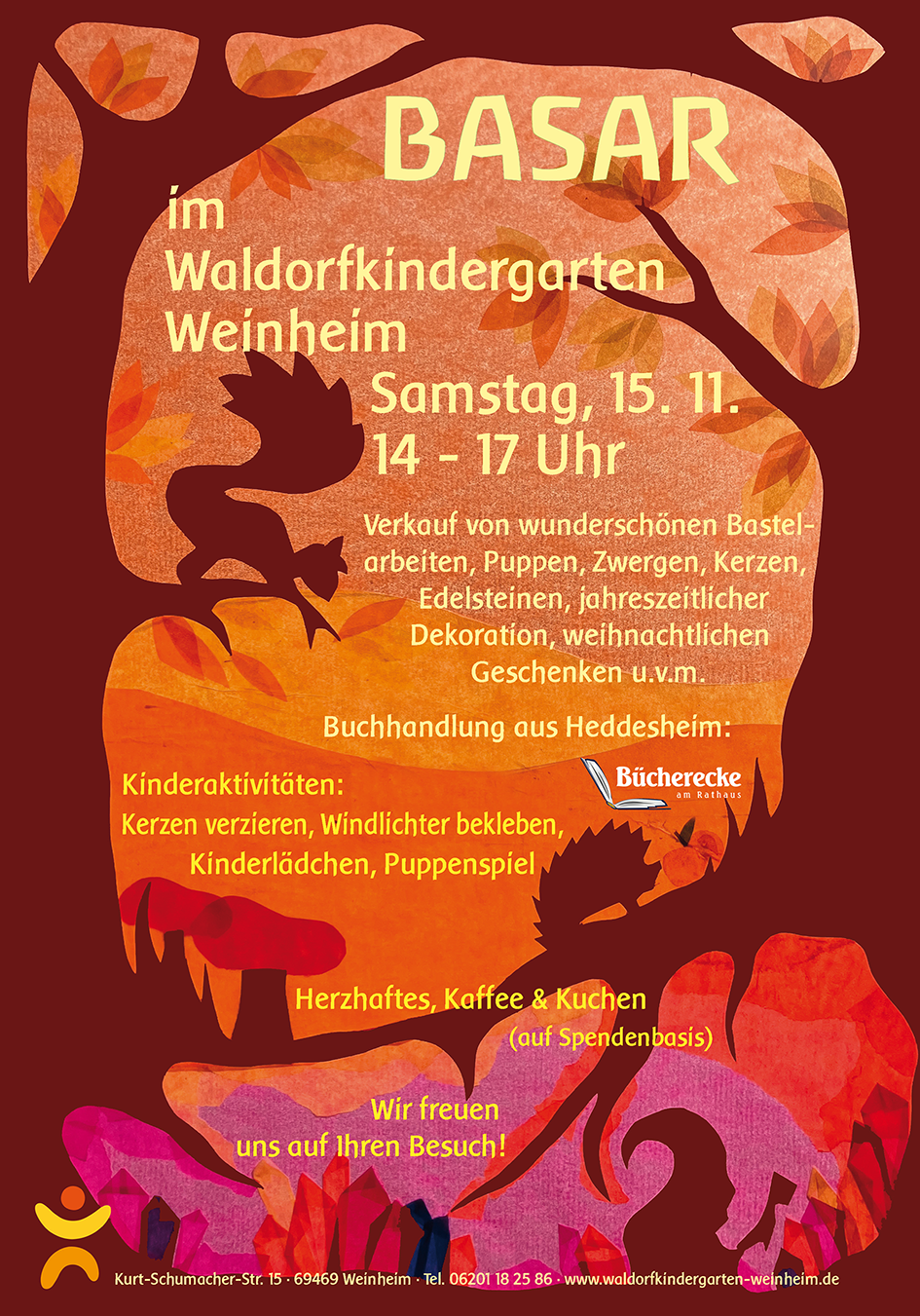 Am Samstag, den 15.11.2025 von 14h bis 17h laden wir wieder zu unserem schönen Basar im Waldorfkindergarten ein. Neben verschiedenen Verkaufsständen, an denen es allerhand schönes und nützliches zu bestaunen und natürlich auch zu erwerben gibt, bieten wir auch Kinderaktivitäten an, die bei den Kleinen für Freude und Unterhaltung sorgen werden. Außerdem gibt es einen Informationsstand an dem Interessierte mehr über unseren Kindergarten und unsere Krippe erfahren können. Für das leibliche Wohl sorgt der Verkauf von selbstgebackenen Kuchen und herzhaften Snacks, die ihr bei uns in gemütlicher Atmosphäre geniessen könnt. Kommt gerne vorbei. Wir freuen uns auf Euch.